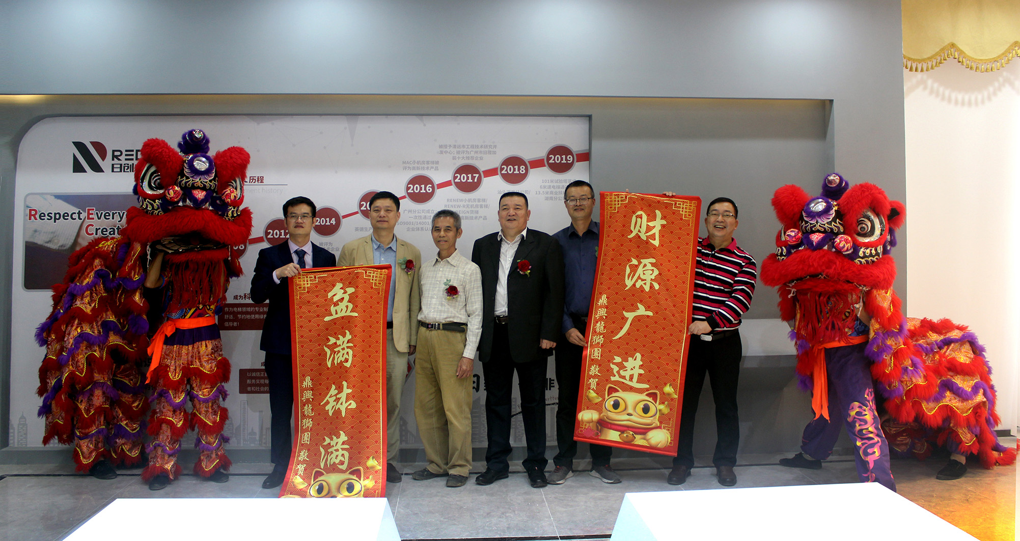 2019年12月31日上午9点,在一阵阵激扬奋进的锣鼓声中,在一场场精彩的舞狮表演中,随着特邀嘉宾刘炳南先生,李永坚先生与公司董事长呼义俊、总经理谢广智、营工中心总监潘明坚、副总经理邓文斌、副总经理林文生、总经理助理陈超雄开业剪彩完成,广东日创电梯有限公司营销工程中心正式乔迁至岭南创意园。